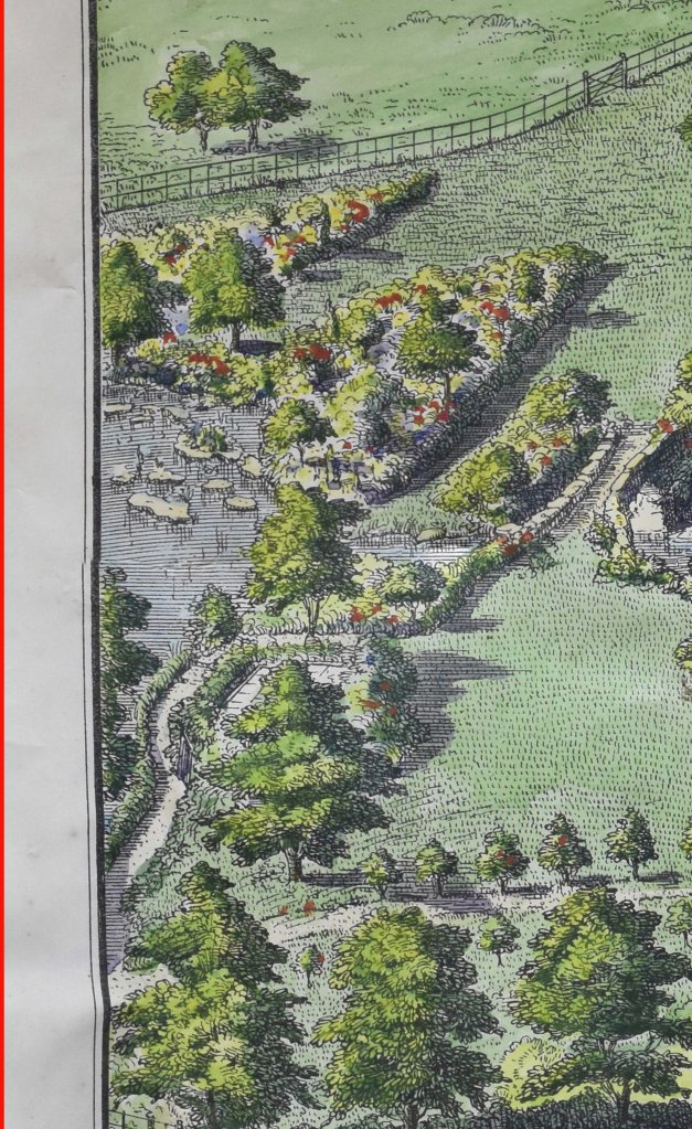 The engraving somewhat annoyingly runs out before the edges of the main pleasure garden, leaving tantalising gaps in our knowledge, most frustratingly we only have half of the Alpine Garden: