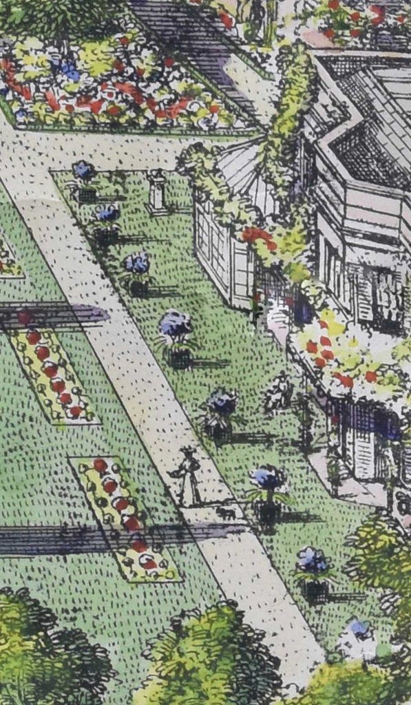 I used it, for example, to count the box planters that pop up in Chapter 17 of Miss Wilmott’s Ghosts, and I am pretty sure that stuff like that would have been depicted accurately – it would have been an easy win for the cartographer. They’re dotted around the site, but I like this part because it includes Miss Willmott herself in it, with her sister Rose, and one of their many dogs: