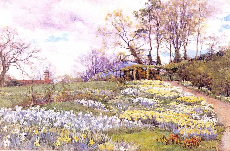 The exact location of Ellen’s orchid house at Warley is not known, but we believe it was to the north of the walled garden, at the top of the hill, just behind the pergola made famous by Alfred Parsons. You can just see it behind the structure in the painting.