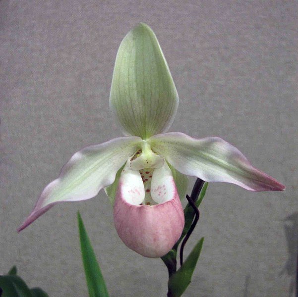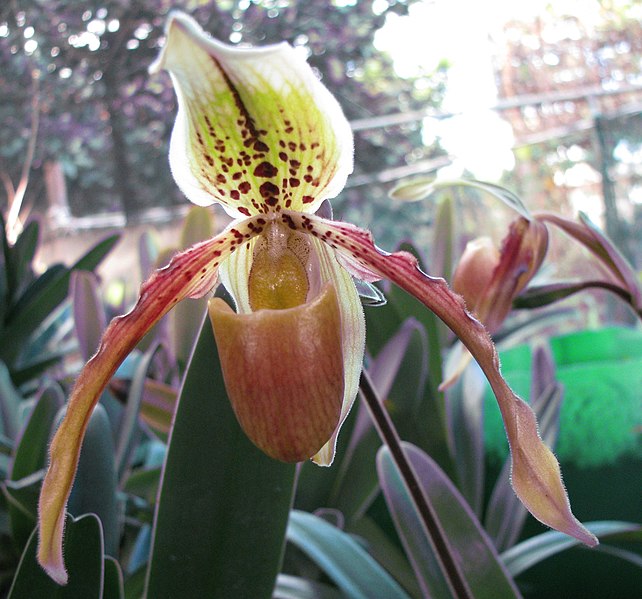However she took it, Mike tells me it is either Paphiopedilum exul or a hybrid of P. exul and another species. Here are a couple of modern images of Paphiopedilum exul for comparison, by day: