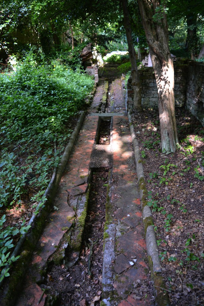 It is almost entirely overgrown now, but there are very faint remains of a fountain in there and, if it’s the one I’m thinking of, there are a few black and red floor tiles left in the eastern end of it, alongside a single piece of cast-iron heating vent.