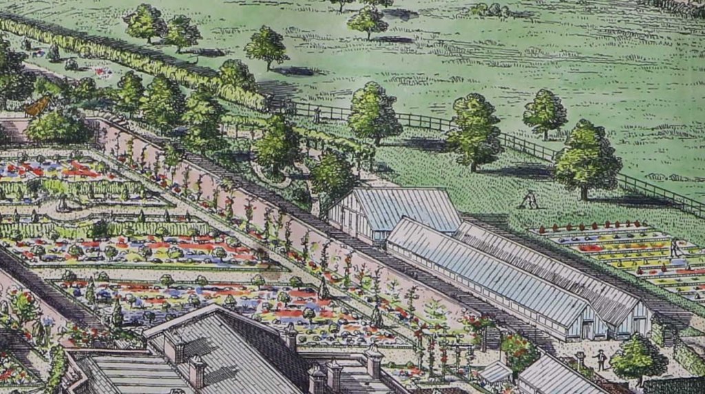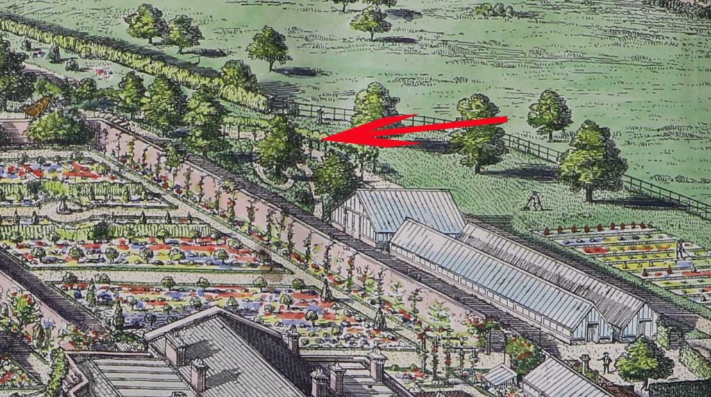 Immediately north of that wall the artist has done some hatching. At first I thought it was a path, but the artist has a different finish for paths. I’m pretty sure it’s just shadow, which doesn’t help us. For the moment, we just don’t know. Given it’s a dark, cold, exposed wall, it certainly wouldn’t have been prime growing space, which was reserved for the south facing wall: