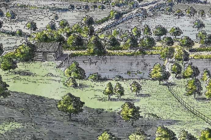 The first clue is in Ellen’s famous ‘Kip and Knyff’ topographical drawing. The cabin is deep in the distance, almost on the horizon.